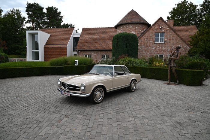 Mercedes-Benz 230 SL Pagode – 1965 Lichaam & verf: Uitgevoerd in een verfijnde crème-bruine kleurencombinatie. Deze auto heeft een oudere restauratie ondergaan die sindsdien in topconditie is gebleven. De lak, onderkant, motorruimte, kofferbak en zelfs onder de vloermatten vertonen geen roestsporen. Er zijn wel wat gebruikssporen aanwezig, zoals duidelijk te zien is op de foto's (bijvoorbeeld bij de uitlijningspennen van de hardtop). De softtop is in uitstekende staat, bruin van kleur, en ziet er prachtig uit. De auto wordt geleverd met de hardtop, die in zeer goede staat verkeert, maar niet gerestaureerd is. Technisch De 2,3-liter motor loopt uitstekend en start direct, zowel koud als warm. Er is geen sprake van overmatige olielekkage, alleen een lichte zweetplek aan de rechterkant van de carterpanpakking. De auto wordt nog steeds actief gebruikt in rally's zonder problemen. Remmen en vering voelen zeer responsief aan, waardoor het een zeer plezierige rijder is. Mechanisch is dit een zeer gezond exemplaar, klaar om van te genieten. Interieur: Het interieur is afgewerkt in bruin. De stoelen zijn niet origineel en vertonen duidelijke slijtage, wat ruimte laat voor verbetering mocht de volgende eigenaar de auto weer naar de fabrieksspecificaties willen brengen. Documentatie: Oorspronkelijk geleverd in de VS, maar alle benodigde papieren voor België zijn aanwezig. De auto is momenteel geregistreerd in België. Extra informatie: Een zeer eerlijke Mercedes 230 SL Pagode uit 1965: roestvrij, kleurecht en matching numbers, prachtig onderhouden en mechanisch sterk. Met zijn aantrekkelijke kleurencombinatie, fijne softtop, zeer goede hardtop en solide uitstraling is dit een zeer gewilde klassieker voor een zeer redelijke prijs. Bezichtigingen zijn mogelijk in Melle, uitsluitend op afspraak.