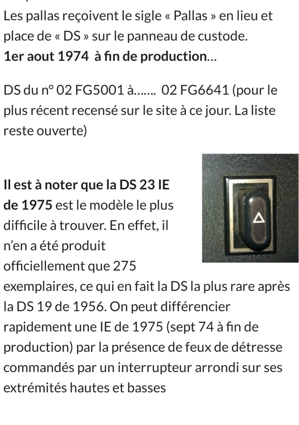 Il est à noté que la DS23 IE de 1975 est le modèle le plus difficile à trouver, en effet, il n'en a été produite que 275 exemplaires. On peut la différencier rapidement par la présence du bouton de feux de détresse commandés par un interrupteur arrondi. (Evidemment présent sur notre modèle)