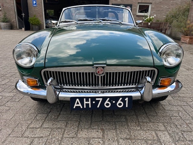 Zeer nette MGB van 1969 met overdrive in British Racing Green. Het is een oudere restauratie, een MG die zeer goed bewaard is gebleven. De auto is meer dan 20 jaar van hetzelfde echtpaar geweest. Zij hebben hem keurig onderhouden. De motor rijdt bijzonder soepel en de overdrive versnellingsbak schakelt perfect. Een zorgeloze, technisch zeer goede auto. De auto is voorzien van 2 HS4 carburateurs met K&N filters, een sportieve upgrade. De auto heeft als extra ene rembekrachtiger ingebouwd, een enorme verbetering. Het plaatwerk is zeer netjes met wat minimale imperfecties. De British Racing Groene kleur staat hem geweldig met de chrome accenten. De chrome Dunlop spaakwielen , bumpers , grille , bagagerek en chromen dorpel covers steken prachtig af bij het groen. Het interieur is uitgerust in zwart vinyl en is erg netjes . Zeer nette stoelen , een zeer nette zwarte vinyl softtop en full tonneau cover. Het houten Moto Lita stuur is het ultieme feature voor elke Engelse ex klassieker. De auto is voor de veiligheid voorzien van een roll bar, deze is geschroefd en kan desgewenst gemakkelijk verwijderd worden.