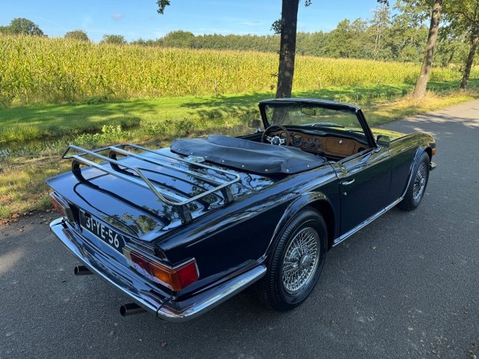 Unieke Triumph TR6 Roadster uit 1974 aangeboden. Deze Triumph TR6 is uitgerust met Overdrive, een zeer krachtige 122 pk 6-cilinder motor met 3 Webers en met een roestvrijstalen dubbel uitlaatsysteem, Royal blue lakwerk en bevindt zich in goede gebruikte staat. Voorzien van 4 chromen spaakvelgen en goede banden. Deze geweldige TR6 is werkelijk een beleving om in te rijden. heeft chromen voor en achterbumpers, chromen tex spiegels en goede rubbers. het lakwerk is in redelijk goede staat met gebruikersporen (oudere restauratie) en geleverd in Royal blue. Deze kleurencombinatie is echt prachtig! deze donker blauwe lak gecombineerd met chromen details en zwart lederen sportstoelen. Buitenkant: De TR6 heeft jaren in een garage opgeslagen gestaan, is door ons volledig nagekeken, Deze Triumph TR6 heeft origineel chroom met gebruikers sporen nette originele chromen spaak velgen, chromen details, goed hang- en sluitwerk. Originele Lucas koplampen, roestvrijstalen dubbel uitlaatsysteem met een prachtig diep geluid en een Monza brandstofdop. De soft-top is perfect en vervangen door een Mohair type in donker blauw. Ook is er een softtop cover aanwezig! het kofferrek op de fotos is aanwezig maar inmiddels verwijderd, deze krijgt u er uiteraard bij! De bodem is solide met rood gepoedercoat chassis. Interieur: Het interieur beschikt over twee originele lederen stoelen met hoofdsteun, een noten dashboard met originele Smiths tellers, overdrive aan de pookknop, lederen handrem-hoes. bestuurder stoel heeft een kleine beschadiging in de wang rechts. Inclusief originele zwarte tapijtset en nette zwarte deurkaarten. Prachtig houten stuurwiel. Interieur en exterieur beide in een oude gerestaureerde staat, enige (bijgewerkte) plekjes en beschadigingen aanwezig. Techniek: De 3 dubbele weber uitvoering is afgesteld en fantastisch! het vermogen gaat hiermee van de standaard 100 naar ruim 122PK een beleving om te rijden en een echte Britse sportwagen. Originele 2498cc 6-cilinder motor +/- 122 pk, perfecte handgeschakelde transmissie met 4 versnellingen en overdrive en chromen kleppendeksel. De Techniek is nagekeken in onze werkplaats en heeft een complete onderhoudsbeurt gehad. 3 weber carburateurs 4 chromen spaakwielen Olie koeler Conversie set achterschokbrekers Teneau cover Electronische Lumenition ontsteking Nieuwe rembekrachtiger Nieuwe rempomp Nieuwe remklauwen en leidingen Voorraam met donker blauwe schaduwband Overdrive Dubbele rvs sportuitlaat Details: Deze TR6 is voor de echte 'petrol head', een zeer nette Engelse sportwagen met een krachtige 2.5 liter motor en prachtige kleuren (Royal Blue) lakwerk in gebruikte staat. Oorspronkelijk komt deze TR6 uit Duitsland, waarna hij in Nederland is geregistreerd. De auto is altijd goed onderhouden en gestald in een verwarmde garage. Een prachtige kans voor de liefhebber met weinig moeite weer in topstaat te maken. U bent van harte welkom deze Triumph te komen bekijken en een uitgebreide proefrit te maken voor u gaat bieden! neem hiervoor contact op met Catawiki inclusief: Export documenten Enkele workshop manuals Oudere taxatierapporten Restauratie fotos Transport: Wij bieden verschillen transport oplossingen door heel Europa en daarbuiten! heeft u interesse in een transport of prijsopgave horen wij dat graag, wij vragen dan een prijs op bij een van onze transport partners. neem hiervoor contact op met Catawiki. Bieden: Wij raden kopers altijd aan de wagen alvorens te bieden te bezichtigen en een proefrit te maken, zet en drukfouten voorbehouden. Wij maken graag aanvullende fotos of een korte video indien u hierom verzoekt. Locatie: De Tr6 staat in Rogat, Nederland (1,5 uur rijden van Amsterdam/Schiphol)