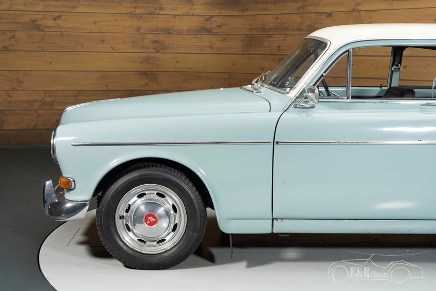 Volvo Amazon in Horizon Blue te koop Qua uitstraling is dit exemplaar uitgevoerd in stijlvol two-tone lakwerk in Horizon Blue met wit dak, wat perfect contrasteert met het tijdloze zwarte interieur. Het samenspel tussen de frisse buitenkleur en de ingetogen, doch elegante binnenkant zorgt voor een authentieke klassieke beleving. De originele velgen met chromen wieldoppen en subtiele details zoals de sierlijsten benadrukken de charme van deze Volvo Amazon, een auto die zowel op de weg als in de garage een genot is om te bezitten.