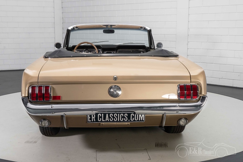 1966 Ford Mustang Cabriolet in Sauterne Gold te koop Zoals u op de foto’s kunt zien is deze Ford Mustang Cabriolet echt een plaatje om te zien. De Mustang is uitgevoerd in de prachtige kleur Sauterne Gold. Een kleur die geweldig staat op deze klassieker en hem een onderscheidend karakter geeft. Het chroomwerk knalt eruit op deze Mustang en combineert prachtig met het Sauterne Gold lakwerk. Het interieur van de Mustang Cabriolet verkeert in een zeer goede staat en is voorzien van beigekleurige ‘Pony’ bekleding en een houten stuurwiel. Om het geheel af te maken is de Mustang uitgerust met een hydraulische witte soft top zodat u bij mooi weer heerlijk kunt genieten van de buitenlucht tijdens het toeren.