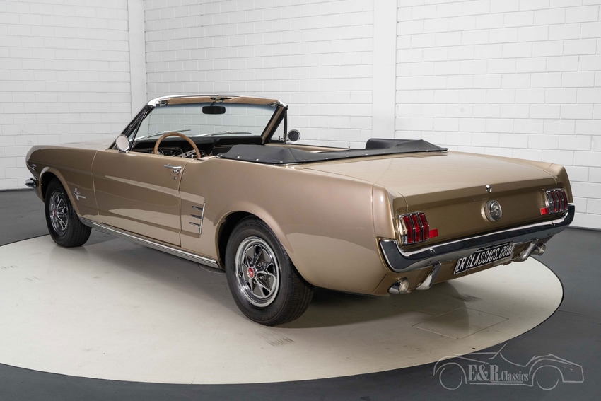 1966 Ford Mustang Cabriolet in Sauterne Gold te koop Zoals u op de foto’s kunt zien is deze Ford Mustang Cabriolet echt een plaatje om te zien. De Mustang is uitgevoerd in de prachtige kleur Sauterne Gold. Een kleur die geweldig staat op deze klassieker en hem een onderscheidend karakter geeft. Het chroomwerk knalt eruit op deze Mustang en combineert prachtig met het Sauterne Gold lakwerk. Het interieur van de Mustang Cabriolet verkeert in een zeer goede staat en is voorzien van beigekleurige ‘Pony’ bekleding en een houten stuurwiel. Om het geheel af te maken is de Mustang uitgerust met een hydraulische witte soft top zodat u bij mooi weer heerlijk kunt genieten van de buitenlucht tijdens het toeren.