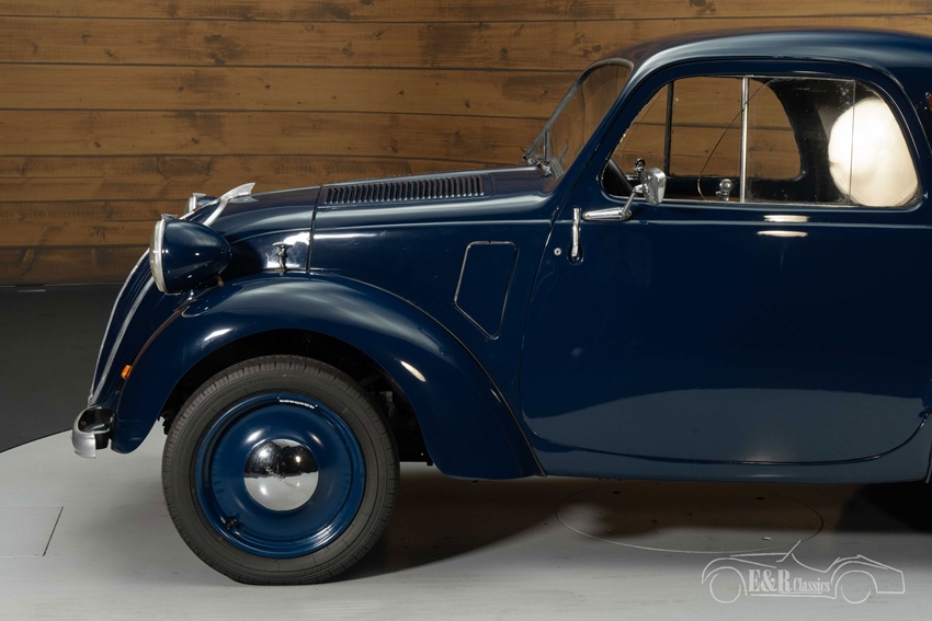 Donkerblauwe Simca 5 te koop Het exterieur van deze Simca 5 straalt pure charme uit. De blauwe lak verkeert in mooie staat en past perfect bij de dichte stalen wielen met stijlvolle chromen wieldeksels. Binnenin is het interieur in 2019 vernieuwd met nieuwe stoel-, deur- en hemelbekleding, wat zorgt voor een frisse en authentieke uitstraling. Het minimalistische interieur beaamt de elegantie van de jaren '30.
