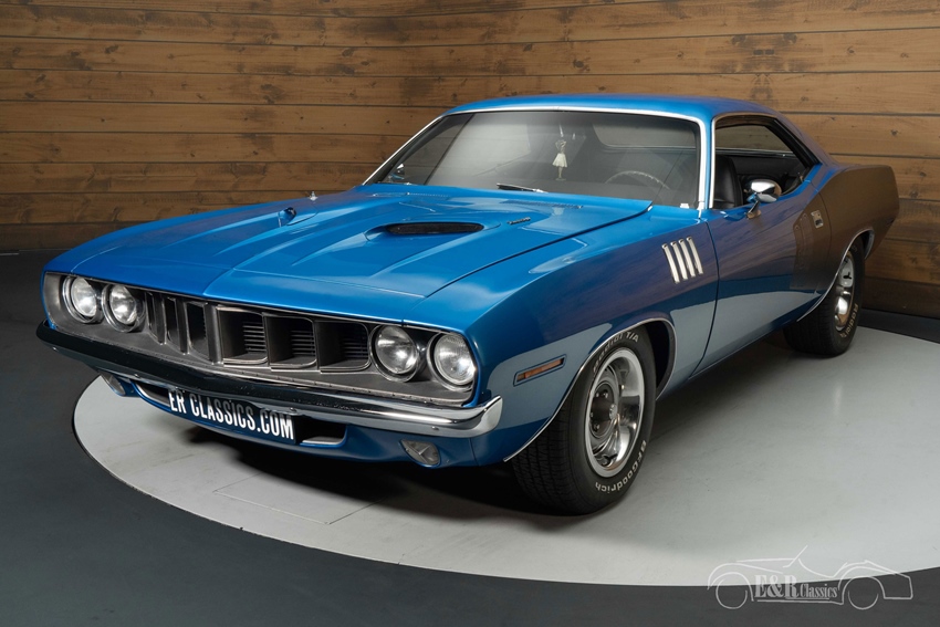 Plymouth Cuda 340 te koop bij E&R Classics In tegenstelling tot de meeste Plymouth Cuda’s is deze bij de restauratie zo origineel mogelijk gehouden. Geen overdreven modificaties, maar de prachtige looks van het origineel zijn behouden. De Cuda is voorzien van een blauw lakwerk met zwarte bestickering die verwijst naar de krachtige 340 CI motor. De kenmerkende split grille, de uitlaat in de achterbumper, de scoops in de motorkap en de fish gill luchtroosters op de voorspatborden maken het een echte eyecatcher. Het interieur verkeert in een zeer goede staat en is uitgerust met luxe stoelen en zwarte kunstlederen bekleding.