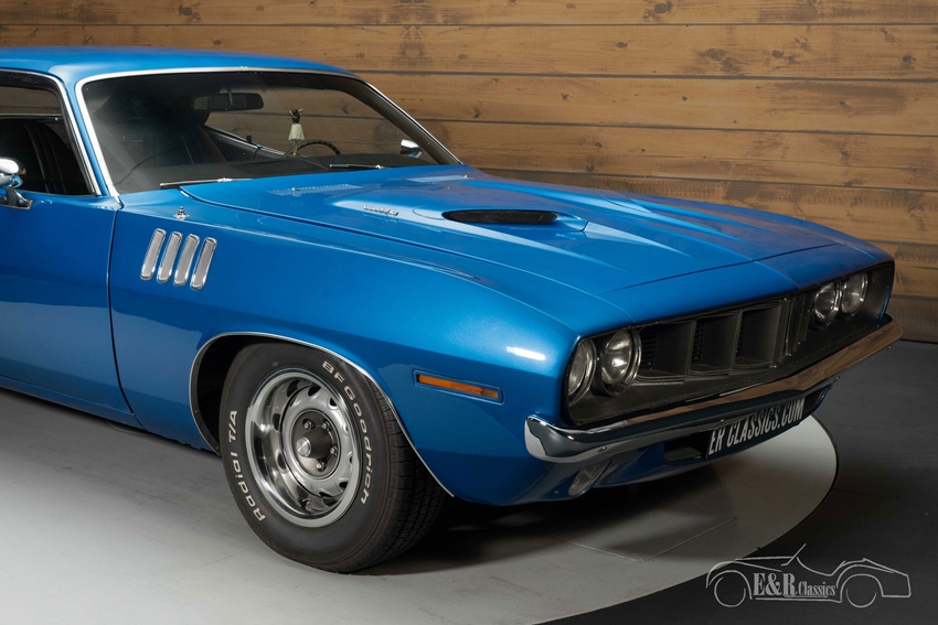 Plymouth Cuda 340 te koop bij E&R Classics In tegenstelling tot de meeste Plymouth Cuda’s is deze bij de restauratie zo origineel mogelijk gehouden. Geen overdreven modificaties, maar de prachtige looks van het origineel zijn behouden. De Cuda is voorzien van een blauw lakwerk met zwarte bestickering die verwijst naar de krachtige 340 CI motor. De kenmerkende split grille, de uitlaat in de achterbumper, de scoops in de motorkap en de fish gill luchtroosters op de voorspatborden maken het een echte eyecatcher. Het interieur verkeert in een zeer goede staat en is uitgerust met luxe stoelen en zwarte kunstlederen bekleding.