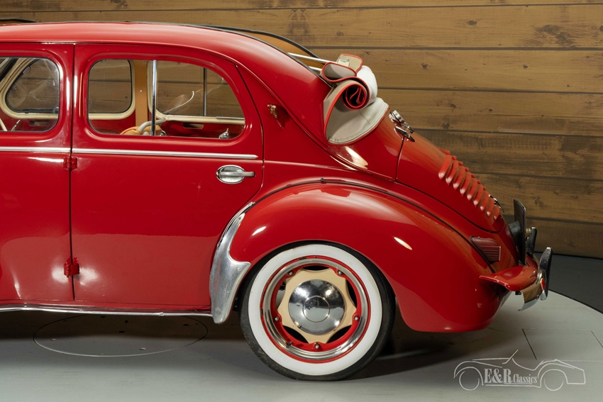 Rode Renault 4CV Cabriolet te koop Het exterieur van de Renault 4CV straalt Franse charme uit met zijn opvallende rode lakwerk, vloeiende rondingen en originele details zoals de klassieke grille en whitewalls. Het interieur is prachtig gerestaureerd met luxe bruine bekleding, afgewerkt met rode piping. Samen met het opvouwbare dak en de minimalistische dashboardindeling biedt deze Renault 4CV Cabriolet een stijlvolle en comfortabele ambiance, perfect voor zomerse ritten.