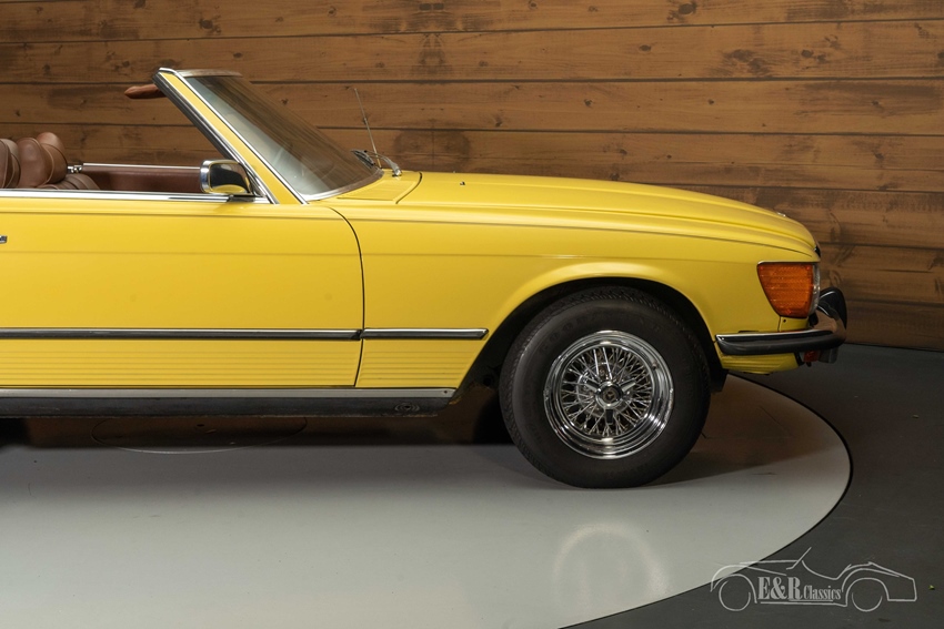 Mercedes-Benz 450 SL met spaakwielen te koop Bij het zien van deze Mercedes-Benz 450 SL uit 1973 krijgt u automatisch een glimlach op uw gezicht. Het gele lakwerk staat de klassieker prachtig en steekt mooi af tegen het donkerbruine interieur. Wat er helemaal een eyecatcher van maakt zijn de chromen spaakwielen. Dit zijn wielen die u niet snel tegenkomt op een Mercedes-Benz, maar werkelijk prachtig staan onder deze oldtimer. De Mercedes-Benz 450 SL is tevens voorzien van een donkerbruine soft top en een hard top in dezelfde kleur als de carrosserie. Ziet u zichzelf al rondtoeren in deze cabriolet?