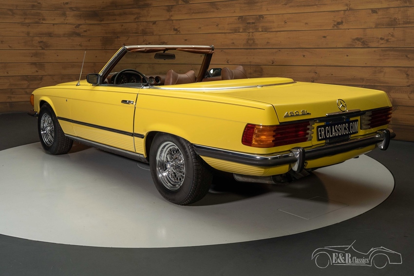 Mercedes-Benz 450 SL met spaakwielen te koop Bij het zien van deze Mercedes-Benz 450 SL uit 1973 krijgt u automatisch een glimlach op uw gezicht. Het gele lakwerk staat de klassieker prachtig en steekt mooi af tegen het donkerbruine interieur. Wat er helemaal een eyecatcher van maakt zijn de chromen spaakwielen. Dit zijn wielen die u niet snel tegenkomt op een Mercedes-Benz, maar werkelijk prachtig staan onder deze oldtimer. De Mercedes-Benz 450 SL is tevens voorzien van een donkerbruine soft top en een hard top in dezelfde kleur als de carrosserie. Ziet u zichzelf al rondtoeren in deze cabriolet?