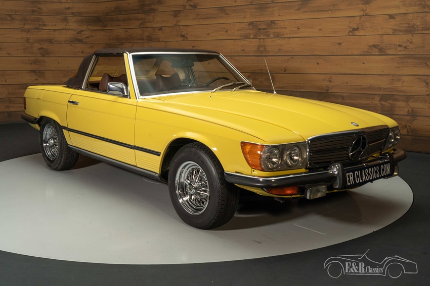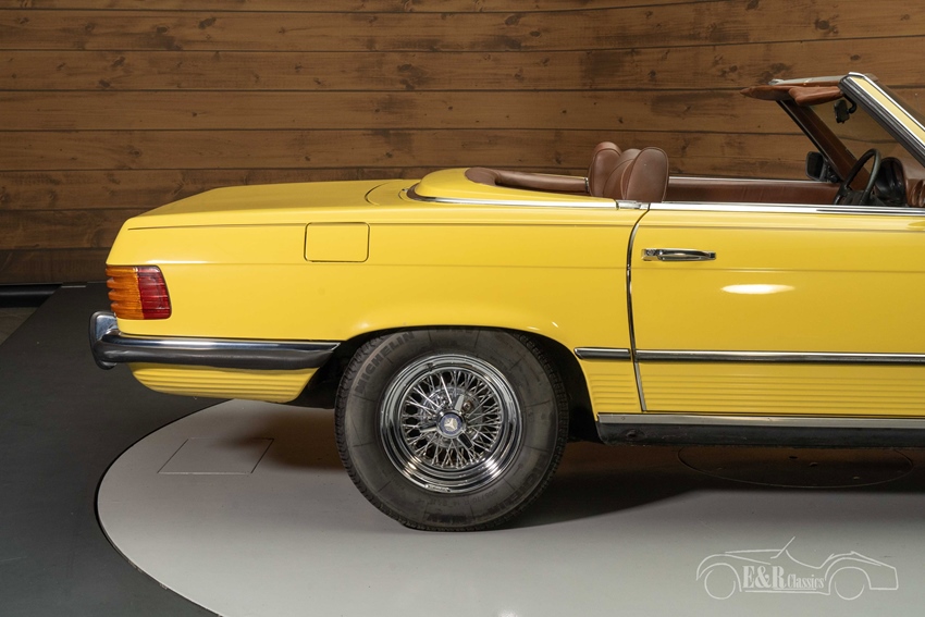 Mercedes-Benz 450 SL met spaakwielen te koop Bij het zien van deze Mercedes-Benz 450 SL uit 1973 krijgt u automatisch een glimlach op uw gezicht. Het gele lakwerk staat de klassieker prachtig en steekt mooi af tegen het donkerbruine interieur. Wat er helemaal een eyecatcher van maakt zijn de chromen spaakwielen. Dit zijn wielen die u niet snel tegenkomt op een Mercedes-Benz, maar werkelijk prachtig staan onder deze oldtimer. De Mercedes-Benz 450 SL is tevens voorzien van een donkerbruine soft top en een hard top in dezelfde kleur als de carrosserie. Ziet u zichzelf al rondtoeren in deze cabriolet?