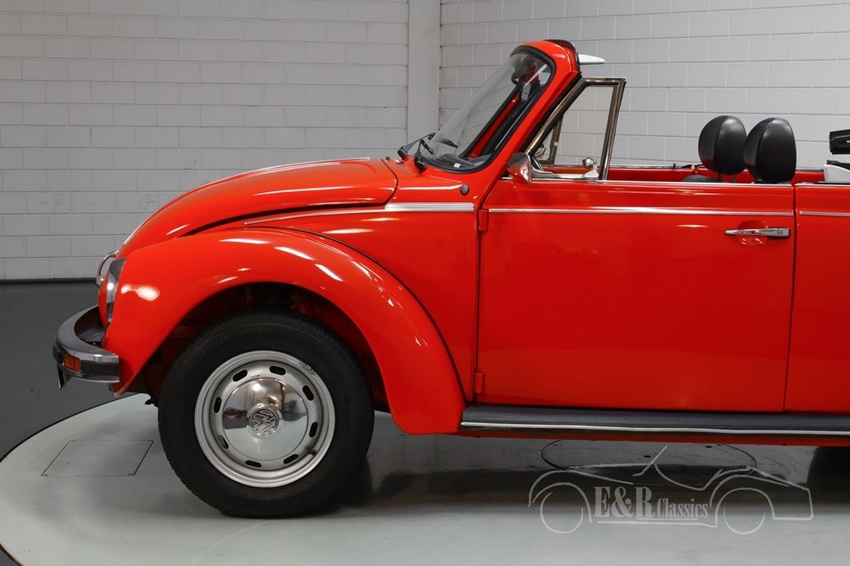 Rode VW Kever Cabriolet uit 1977 te koop Alsof een Volkswagen Kever er van zichzelf al niet geweldig uitziet, is deze Kever ook nog eens voorzien van een prachtig rood lakwerk. Deze kleur past helemaal bij de Duitse klassieker en combineert erg mooi met alle chromen accessoires. De Kever is tevens voorzien van een zwart interieur en zwarte soft top die mooi afsteekt tegen het rode lakwerk. Kortom, een zeer compleet uitgeruste Kever Cabrio die helemaal klaar is voor zijn nieuwe eigenaar.