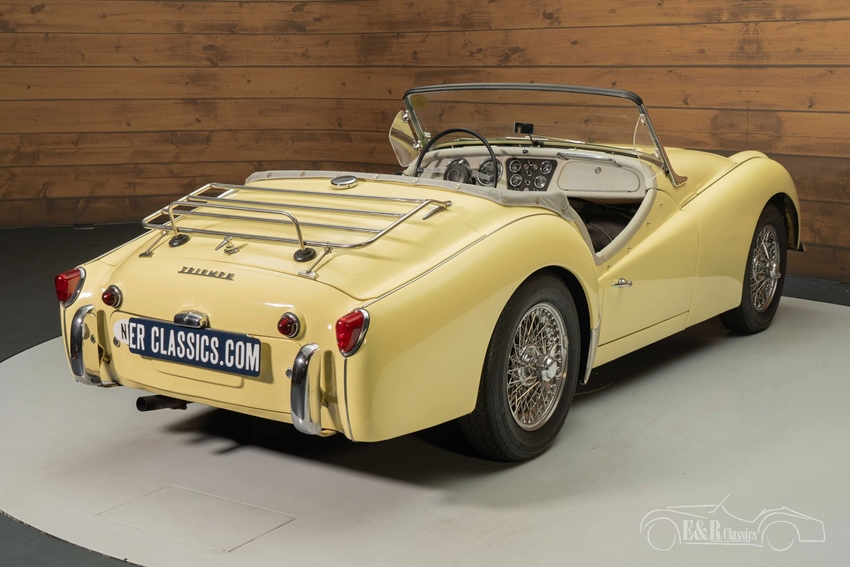 Triumph TR3A met chromen spaakwielen te koop De Triumph TR3A die we hier te koop aanbieden verkeert optisch in een goede staat. Hij is voorzien van een geel lakwerk en diverse extra’s zoals een chromen bagagerek, zwarte soft top, grijze tonneaucover en chromen spaakwielen. Het grijze interieur heeft hier en daar wat gebruikssporen die helemaal passen bij het karakter van deze British Classic Car. Kortom, een technisch zeer goed onderhouden Triumph TR3A die helemaal klaar is voor zijn nieuwe eigenaar.