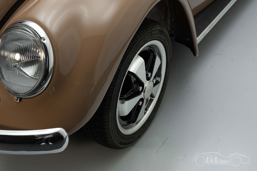 Volkswagen Kever Ovaal Ragtop met Fuchs velgen te koop De Kever Ovaal Ragtop die we hier te koop aanbieden is uitgevoerd in een zeer smaakvolle kleurcombinatie. Het bruine lakwerk combineert erg goed met het chroomwerk en heeft hier en daar wat scheurtjes en kleine gebruikssporen rondom. Hij staat op een set Fuchs velgen die de Kever een onderscheidend karakter geven. Het tan-kleurige interieur verkeert in een nette staat en zorgt voor een bijzondere kleurstelling in combinatie met het lakwerk.
