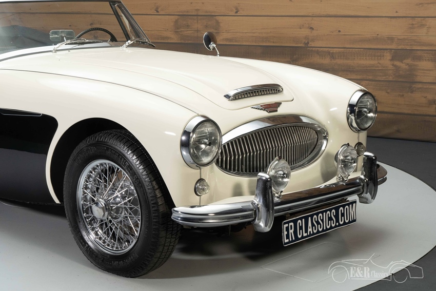 Austin-Healey 3000 MK3 in Old English White te koop De Austin-Healey 3000 MK3 die we hier te koop aanbieden is uitgevoerd in de prachtige kleur Old English White. Om de auto extra karakter te geven is er gekozen voor een zwart vlak op de zijkant wat er een echte eyecatcher van maakt. De chromen spaakwielen en accessoires maken de klassieke look compleet. Het interieur verkeert in een nette, originele staat en heeft een notenhouten dashboard. De bekleding vertoont hier en daar wat kleine gebruikssporen. Er is een nieuwe soft top geplaatst die u in een handomdraai inklapt zodat u heerlijk kunt genieten van de buitenlucht tijdens het toeren.