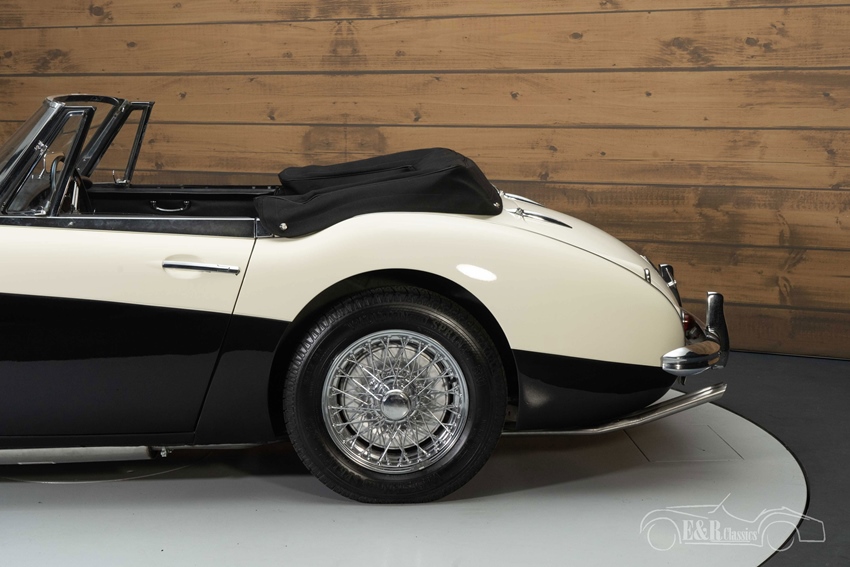 Austin-Healey 3000 MK3 in Old English White te koop De Austin-Healey 3000 MK3 die we hier te koop aanbieden is uitgevoerd in de prachtige kleur Old English White. Om de auto extra karakter te geven is er gekozen voor een zwart vlak op de zijkant wat er een echte eyecatcher van maakt. De chromen spaakwielen en accessoires maken de klassieke look compleet. Het interieur verkeert in een nette, originele staat en heeft een notenhouten dashboard. De bekleding vertoont hier en daar wat kleine gebruikssporen. Er is een nieuwe soft top geplaatst die u in een handomdraai inklapt zodat u heerlijk kunt genieten van de buitenlucht tijdens het toeren.