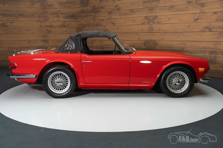 Triumph TR6 met hard top te koop De Triumph TR6 die we hier te koop aanbieden is echt een plaatje om te zien. Hij is uitgevoerd in een mooi rood lakwerk dat helemaal past bij deze jaren 70 classic car en erg goed combineert met het chroomwerk. Hij staat op een set gespoten spaakwielen die mooi afsteken tegen het lakwerk. Hij is tevens uitgerust met een bagagerek en windscherm dat zorgt voor extra comfort tijdens het rijden. Het unieke van deze TR6 is dat hij naast een zwarte soft top ook beschikt over een hard top in dezelfde kleur als de carrosserie. Het zwarte interieur verkeert in een nette staat en beschikt over comfortabele stoelen die bekleed zijn met stof en kunstleder. Het houten dashboard en stuurwiel maken de klassieke look helemaal af.