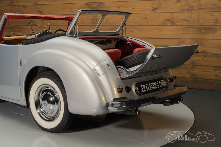 Triumph Roadster 2000 in zeer goede staat te koop De Triumph Roadster 2000 die we hier te koop aanbieden is echt een plaatje om te zien. Hij is uitgevoerd in een zilvergrijs metallic lakwerk dat erg mooi staat op de klassieker en perfect combineert met het chroomwerk, de white walls en de enorme grille. Het interieur van de Roadster is ook zeer smaakvol uitgevoerd en uitgerust met donkerrode lederen bekleding en een prachtig houten dashboard. Het unieke van deze Triumph Roadster 2000 is de originele Dicky Seat met eigen windscherm. Dit zorgt niet alleen voor een unieke look, maar creëert ook nog eens 2 extra zitplaatsen.