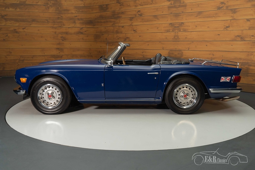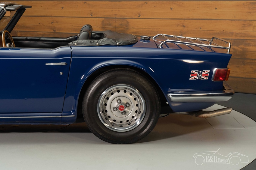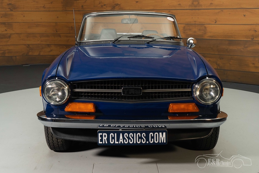 Blauwe Triumph TR6 te koop De Triumph TR6 die we hier te koop aanbieden is uitgevoerd in een mooi donkerblauw lakwerk. Deze kleur staat prachtig op een jaren 70 klassieker en combineert erg mooi met het chroomwerk. Het interieur van de Triumph verkeert in een zeer nette staat en een aantal jaar geleden is er een nieuw dashboard geplaatst en een Motolita sportstuur en zijn de stoelen vernieuwd. De TR6 is tevens uitgerust met een zwarte soft top die u in een handomdraai inklapt zodat u kunt genieten van de buitenlucht tijdens het toeren.