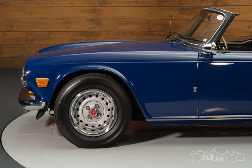 Blauwe Triumph TR6 te koop De Triumph TR6 die we hier te koop aanbieden is uitgevoerd in een mooi donkerblauw lakwerk. Deze kleur staat prachtig op een jaren 70 klassieker en combineert erg mooi met het chroomwerk. Het interieur van de Triumph verkeert in een zeer nette staat en een aantal jaar geleden is er een nieuw dashboard geplaatst en een Motolita sportstuur en zijn de stoelen vernieuwd. De TR6 is tevens uitgerust met een zwarte soft top die u in een handomdraai inklapt zodat u kunt genieten van de buitenlucht tijdens het toeren.