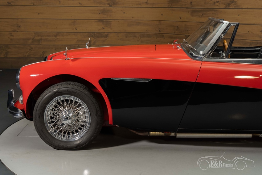 Austin Healey in Colorado Red met zwart lakwerk De Healey die we hier te koop aanbieden is een plaatje om te zien. Hij is uitgevoerd in de prachtige two-tone kleurstelling Colorado Red met zwart. Een kleurstelling die prachtig staat op de Austin Healey en erg mooi combineert met het chroomwerk en de zwarte soft top. Het interieur van de klassieker verkeert in een nette staat en is uitgerust met zwarte bekleding met witte piping, een houten dashboard en Moto-Lita stuurwiel.