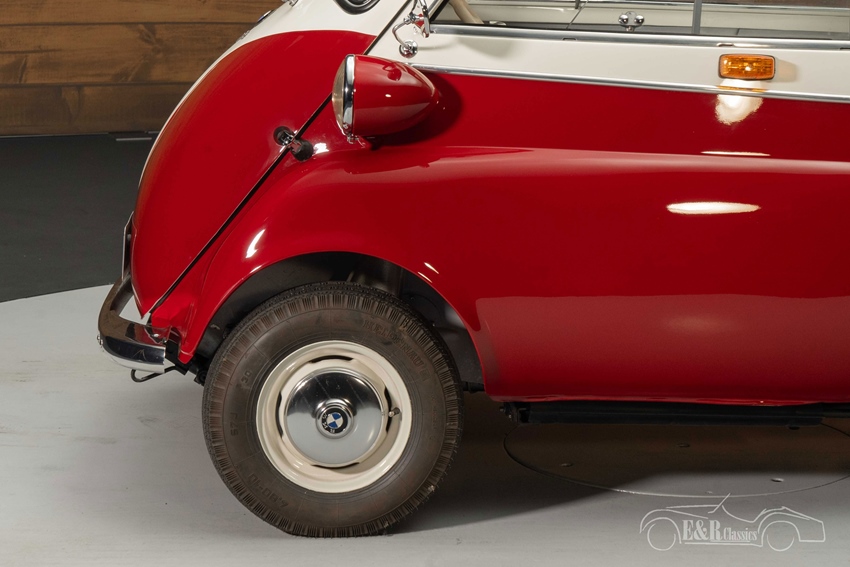 BMW Isetta 250 met two-tone lakwerk te koop Een BMW Isetta is een zeldzame verschijning die u niet snel tegenkomt, laat staan in de staat waarin deze auto verkeert. Het two-tone lakwerk staat prachtig op de BMW en maakt er een echte eyecatcher van. Het interieur is een combinatie van kunstleder en stof met een leuk ruitmotief dat helemaal past bij een jaren 50 klassieker. De Isetta is tevens uitgerust met een rood zonnevizier en een vouwdakje zodat u heerlijk kunt genieten van de buitenlucht tijdens het rijden.