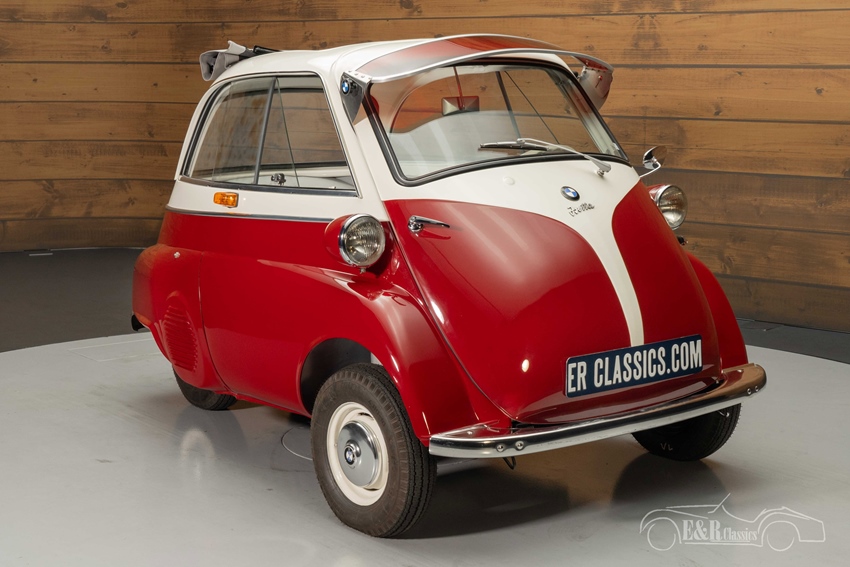 BMW Isetta 250 met two-tone lakwerk te koop Een BMW Isetta is een zeldzame verschijning die u niet snel tegenkomt, laat staan in de staat waarin deze auto verkeert. Het two-tone lakwerk staat prachtig op de BMW en maakt er een echte eyecatcher van. Het interieur is een combinatie van kunstleder en stof met een leuk ruitmotief dat helemaal past bij een jaren 50 klassieker. De Isetta is tevens uitgerust met een rood zonnevizier en een vouwdakje zodat u heerlijk kunt genieten van de buitenlucht tijdens het rijden.