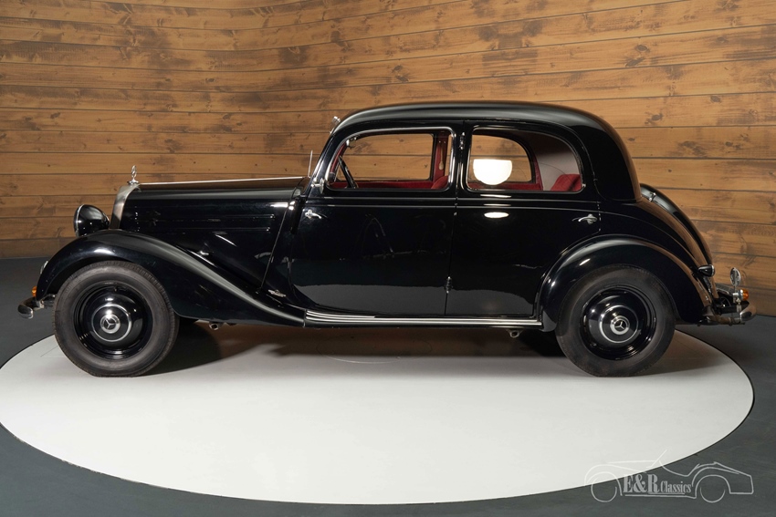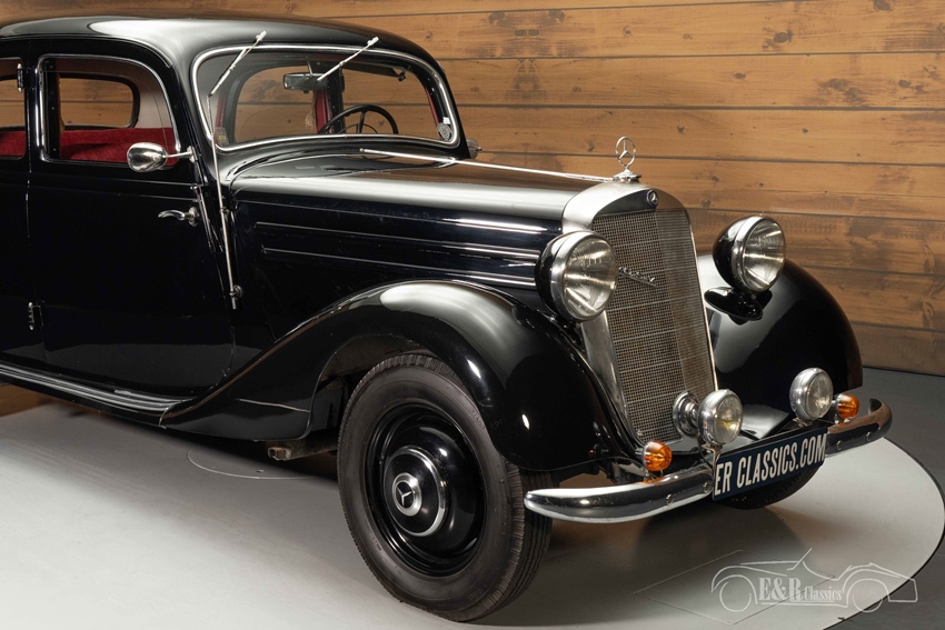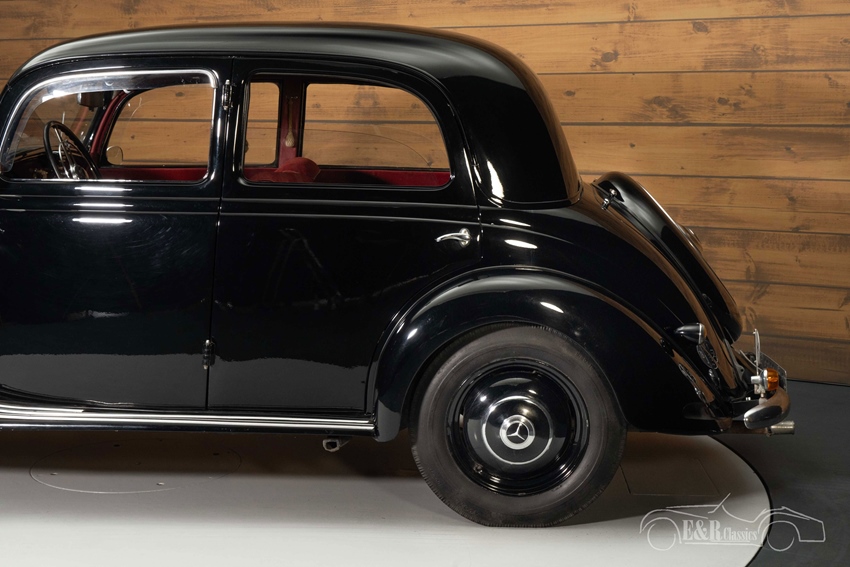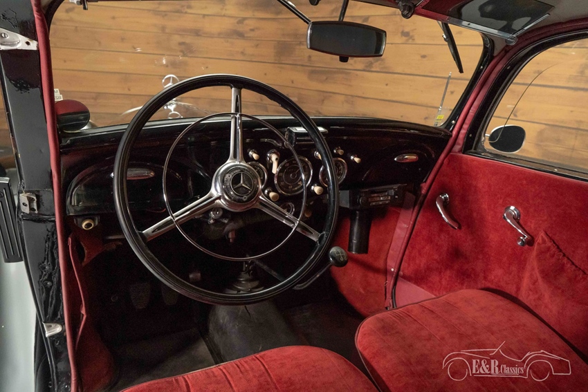 Zwarte Mercedes-Benz 170 VA te koop De Mercedes-Benz 170 VA die we hier te koop aanbieden is uitgevoerd in een zwart lakwerk dat erg mooi combineert met de imposante grille en alle chromen accessoires. Het stoffen interieur is rood uitgevoerd en steekt mooi af tegen het zwarte lakwerk. De combinatie van het zwart en rood maakt een stijlvolle verschijning van deze klassieke Mercedes-Benz.