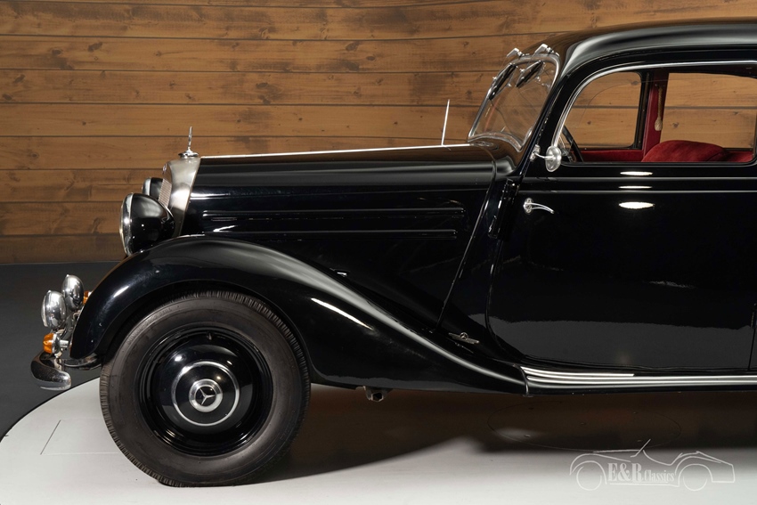 Zwarte Mercedes-Benz 170 VA te koop De Mercedes-Benz 170 VA die we hier te koop aanbieden is uitgevoerd in een zwart lakwerk dat erg mooi combineert met de imposante grille en alle chromen accessoires. Het stoffen interieur is rood uitgevoerd en steekt mooi af tegen het zwarte lakwerk. De combinatie van het zwart en rood maakt een stijlvolle verschijning van deze klassieke Mercedes-Benz.