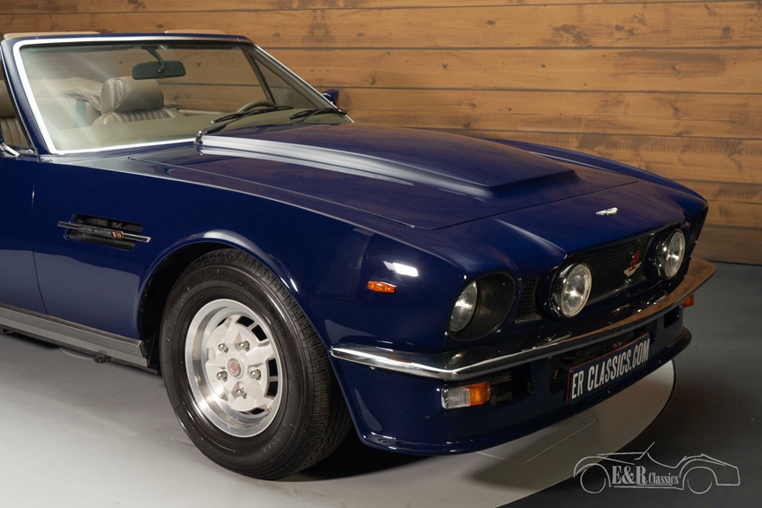 Aston-Martin V8 Volante Cabriolet LHD | Slechts 849 gebouwd | Matching Numbers | 1981 Highlights: -    81.080 km -    Links gestuurd -    Originele kleurcombinatie -    Slechts 849 gebouwd -    Matching numbers motor en kleurstelling Links gestuurde Aston-Martin V8 Volante Cabriolet te koop Wij bieden te koop aan deze prachtige Aston-Martin V8 Volante Cabriolet uit 1981. De Aston-Martin is afkomstig van de 4e eigenaar die de klassieker goed heeft laten onderhouden. Er zijn diverse facturen van het gepleegde onderhoud aanwezig. De Aston-Martin V8 Volante Cabriolet is een zeldzame verschijning, waarvan er slechts 849 zijn gebouwd. De auto die we hier aanbieden is er een met Weber carburateur, waarvan er slechts 282 links gestuurde zijn gebouwd. Een erg zeldzame klassieker dus en zeer gewild onder liefhebbers. De V8 Volante wordt aangedreven door de matching numbers 5.3 liter V8 motor die gekoppeld is aan een automatische versnellingsbak. De auto heeft een lage tellerstand van 81.080 km. Aston-Martin V8 Volante Cabriolet in Canterbury Blue te koop De Aston-Martin V8 Volante Cabriolet die we hier te koop aanbieden is echt een plaatje om te zien. De klassieker is uitgevoerd in de matching numbers, af-fabriek kleurstelling Canterbury Blue met een tan lederen interieur. De kleur staat prachtig op de Aston-Martin en combineert erg mooi met het tan interieur. Het dashboard verkeert in een nette, originele staat en is uitgerust met houtinleg wat helemaal past bij een jaren 80 klassieker. Om het geheel af te maken is er gekozen voor een beigekleurige soft top. Aston-Martin V8 Volante Cabriolet kopen? Bent u op zoek naar een Aston-Martin V8 Volante Cabriolet uit 1981? Laat dan uw gegevens achter via het contactformulier op deze pagina of bel direct met +31 416 751 393. Onze verkopers geven u graag antwoord op al uw vragen of maken zelfs een persoonlijke shopvideo voor u. Inkoop, inruil en bemiddeling mogelijk. Levering in België met oldtimer inschrijving mogelijk. U betaalt geen import-taksen. Wij kunnen helpen met financiering. Vraag ons verkoopteam.