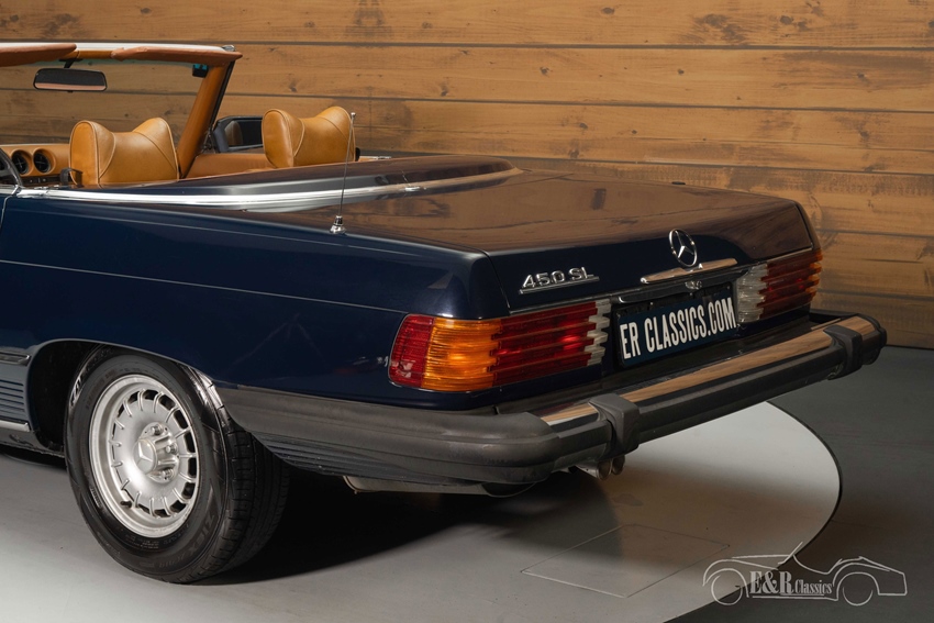 Donkerblauwe Mercedes-Benz 450 SL te koop De Mercedes-Benz die we hier te koop aanbieden is uitgevoerd in een mooi donkerblauw lakwerk dat prachtig staat op de klassieker en mooi combineert met het chroomwerk en de kroonkurk velgen. Het bruine interieur verkeert in een nette staat en steekt mooi af tegen het donkerblauwe lakwerk. De Mercedes-Benz is uitgerust met een donkerbruine soft top die u gemakkelijk inklapt zodra de zon schijnt.