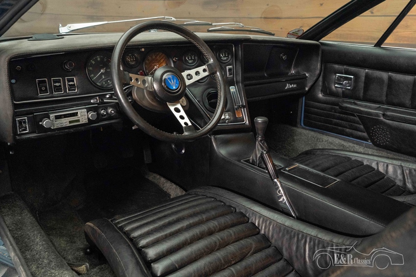 Maserati Bora in Celeste te koop De Maserati Bora die we hier te koop aanbieden is tijdens zijn restauratie opnieuw gespoten in de fabriekskleur Celeste. Een prachtige lichtblauwe metallic kleur die helemaal past bij de exclusieve look van deze Italiaanse sportwagen. Hij staat op een set originele Campagnolo velgen met RVS hart die prachtig combineren met de raamstijlen en het RVS dak van de klassieker. Het interieur verkeert in een nette, originele staat en is uitgerust met zwarte lederen bekleding.