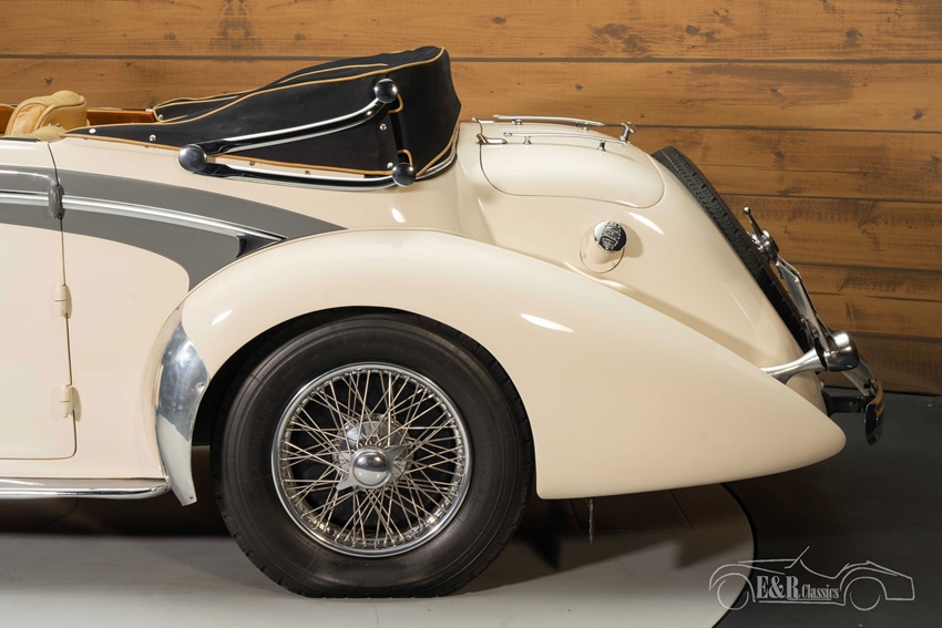 The Delahaye has been restored in the past and given a new paint. The cream-coloured paintwork looks great on the classic and contrasts nicely with the brown leather interior. The Delahaye is equipped with a black soft top.