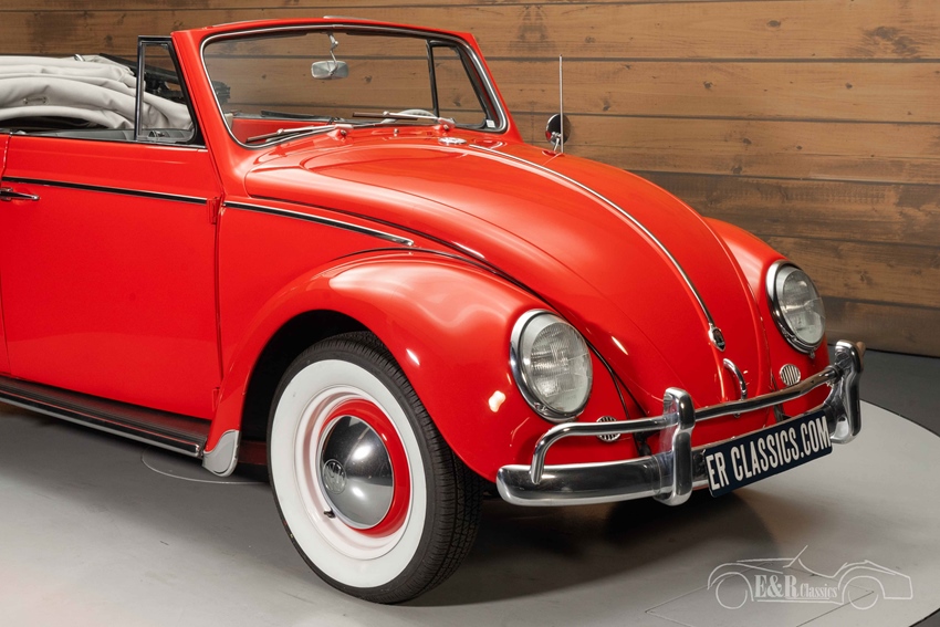 Rode Volkswagen Kever Cabriolet uit 1962 te koop De jaren 60 VW Kever Cabriolet die we hier te koop aanbieden is echt een plaatje om te zien. Hij is uitgevoerd in een prachtig rood lakwerk dat erg mooi combineert met het chroomwerk en de white walls. Het interieur heeft een grijs tapijt en echte lederen bekleding. Om het geheel af te maken is er gekozen voor een donkergrijze, stoffen soft top.