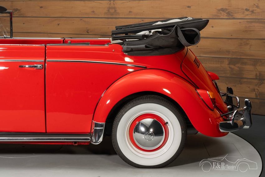 Rode Volkswagen Kever Cabriolet uit 1962 te koop De jaren 60 VW Kever Cabriolet die we hier te koop aanbieden is echt een plaatje om te zien. Hij is uitgevoerd in een prachtig rood lakwerk dat erg mooi combineert met het chroomwerk en de white walls. Het interieur heeft een grijs tapijt en echte lederen bekleding. Om het geheel af te maken is er gekozen voor een donkergrijze, stoffen soft top.