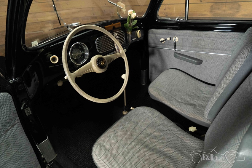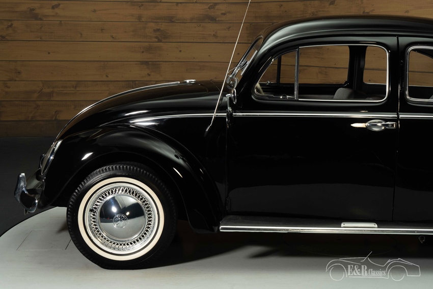 Zwarte Volkswagen Kever Zwitter uit 1952 te koop De Volkswagen Kever Zwitter is uitgevoerd in een prachtig zwart lakwerk dat erg mooi combineert met het chroomwerk, de verchroomde wieldeksels en de subtiele whitewalls. Met de klassieke split window achterruit straalt hij nostalgie uit en onderscheidt hij zich van de rest. Het interieur verkeert in een nette, originele staat en is uitgerust met stoffen bekleding en het kenmerkende vernieuwde dashboard met grote teller.