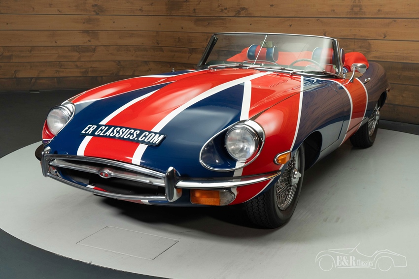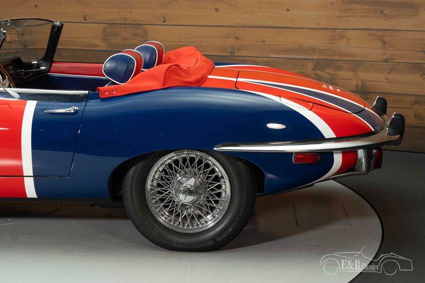 Jaguar E-Type Series 2 Cabriolet met Union Jack lakwerk te koop Wat deze E-Type werkelijk uniek maakt, is het spectaculaire Union Jack-lakwerk. Niet zomaar een bestickering, maar met de hand aangebracht door een vakman, waardoor elk detail perfect tot zijn recht komt. De lak wordt versterkt door de contrasterende rode softtop en het elegante two-tone interieur, dat luxe en nostalgie uitstraalt. Verchroomde spaakwielen en een houten sportstuur maken de klassieke uitstraling compleet.
