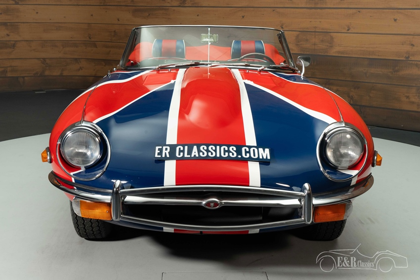 Jaguar E-Type Series 2 Cabriolet met Union Jack lakwerk te koop Wat deze E-Type werkelijk uniek maakt, is het spectaculaire Union Jack-lakwerk. Niet zomaar een bestickering, maar met de hand aangebracht door een vakman, waardoor elk detail perfect tot zijn recht komt. De lak wordt versterkt door de contrasterende rode softtop en het elegante two-tone interieur, dat luxe en nostalgie uitstraalt. Verchroomde spaakwielen en een houten sportstuur maken de klassieke uitstraling compleet.