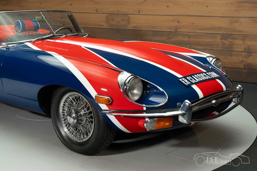 Jaguar E-Type Series 2 Cabriolet met Union Jack lakwerk te koop Wat deze E-Type werkelijk uniek maakt, is het spectaculaire Union Jack-lakwerk. Niet zomaar een bestickering, maar met de hand aangebracht door een vakman, waardoor elk detail perfect tot zijn recht komt. De lak wordt versterkt door de contrasterende rode softtop en het elegante two-tone interieur, dat luxe en nostalgie uitstraalt. Verchroomde spaakwielen en een houten sportstuur maken de klassieke uitstraling compleet.