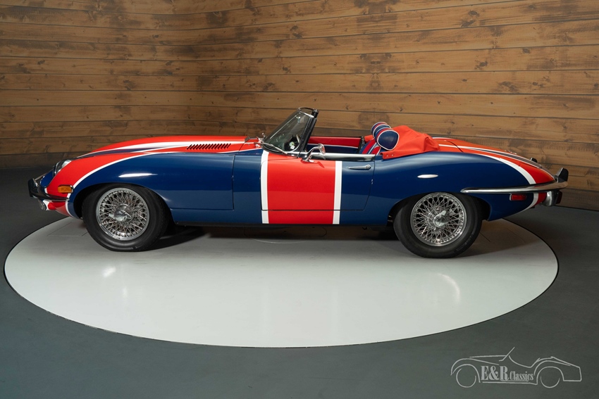 Jaguar E-Type Series 2 Cabriolet met Union Jack lakwerk te koop Wat deze E-Type werkelijk uniek maakt, is het spectaculaire Union Jack-lakwerk. Niet zomaar een bestickering, maar met de hand aangebracht door een vakman, waardoor elk detail perfect tot zijn recht komt. De lak wordt versterkt door de contrasterende rode softtop en het elegante two-tone interieur, dat luxe en nostalgie uitstraalt. Verchroomde spaakwielen en een houten sportstuur maken de klassieke uitstraling compleet.
