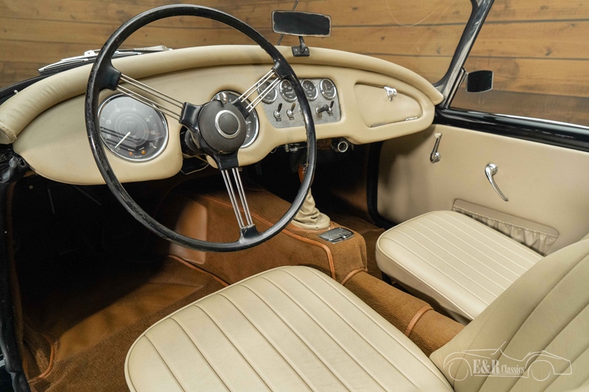 Zwarte Daimler SP250 Dart te koop Deze Daimler SP250 straalt pure elegantie uit met zijn diepzwarte lakwerk, chroomwerk en schitterende chromen spaakwielen. Het contrasterende beigekleurige interieur en bijpassende soft top zorgen voor een verfijnde en stijlvolle uitstraling. Het interieur biedt een perfect voorbeeld van klassieke Britse luxe, met aandacht voor detail en comfort. Deze auto combineert tijdloze schoonheid met rijplezier, waardoor het een perfecte keuze is voor de liefhebber van unieke klassiekers.