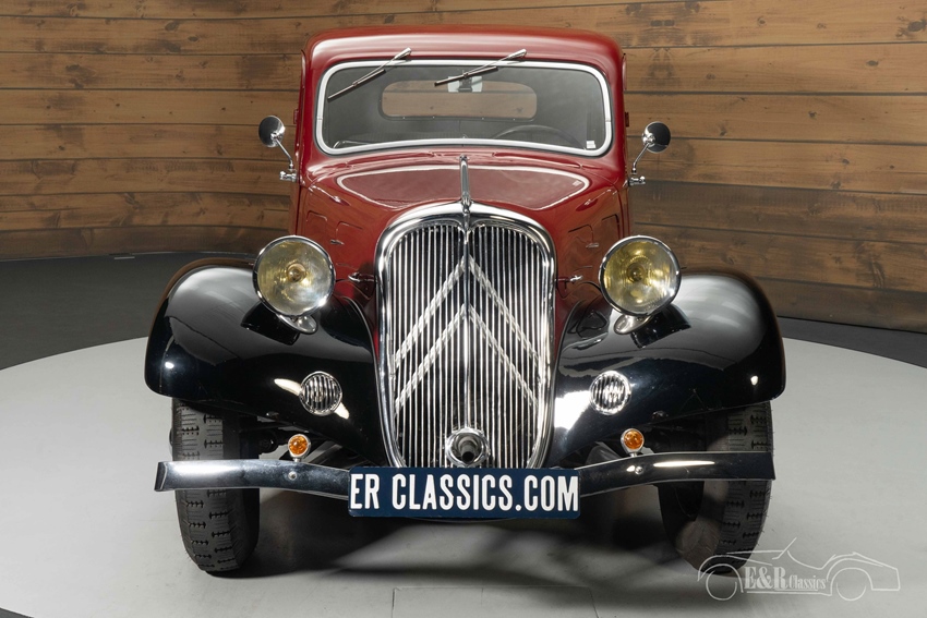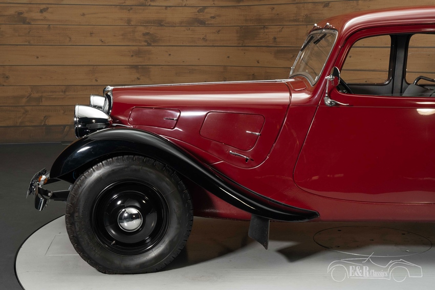 Citroën Traction Avant 7C met zeldzame opties te koop Het exterieur van deze Traction Avant is een lust voor het oog. De diep rode lak gecombineerd met zwarte spatborden en wielen zorgt voor een elegante uitstraling. Dit model heeft enkele zeldzame kenmerken, zoals koplampsteunen zonder stelgaten, een reservewieldeksel uit drie delen en bumpersteunen met slechts één bout in plaats van twee. De authentieke benzinetank met twee vuldoppen en het nummerbord met verlichting ("Plaque de Police") onderstrepen de originele details. Binnenin straalt het interieur pure klasse uit, met twee dashboardkastjes, een originele centrale instrumentatie en een speciaal vervaardigde binnenspiegel. Bovendien is het uitzetkompas voor het raam nog origineel, een detail dat zelden wordt teruggevonden. De hoogwaardige bekleding, geweven volgens de traditionele Franse methode, zorgt voor een perfect samenspel met het exterieur.