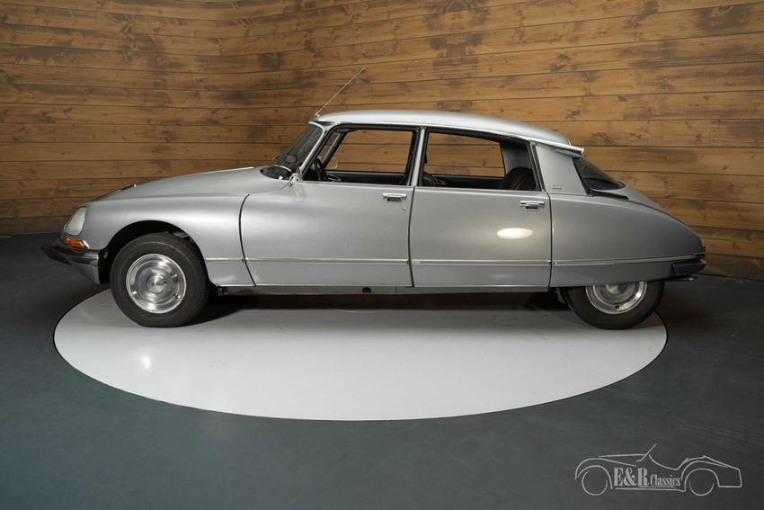 Citroën DS 23 Pallas met Citromatic versnellingsbak te koop Het zilvergrijze lakwerk staat de elegante carrosserievorm perfect en laat de gestroomlijnde lijnen prachtig tot hun recht komen. De originele wieldoppen en verfijnde chroomaccenten geven de auto zijn klassieke uitstraling. Binnenin ademt het interieur karakter: het zwarte leren interieur toont een fraai patina dat het rijke verleden van deze auto weerspiegelt. Het kenmerkende éénspaaks stuurwiel en de chique afwerking van de deurpanelen maken het samenspel tussen binnen- en buitenkant compleet. Een zeldzame combinatie van stijl, techniek en geschiedenis – klaar voor een liefhebber met oog voor originaliteit.