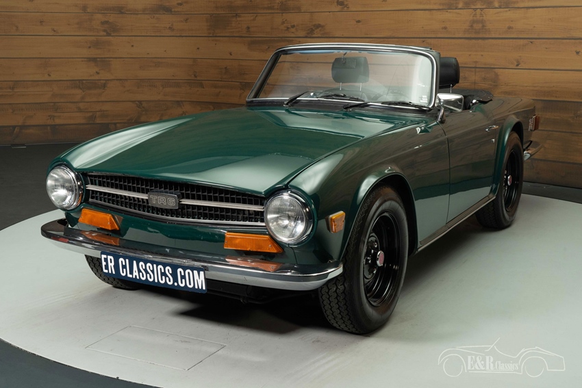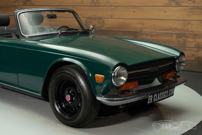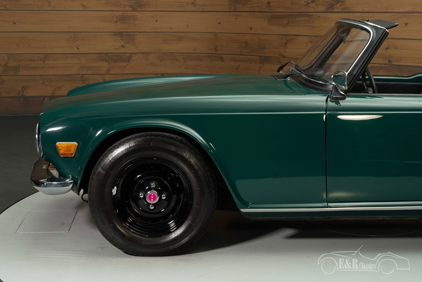 Triumph TR6 te koop in Mallard Green De carrosserie van de TR6 is uitgevoerd in de originele kleur Mallard Green, een diepe, klassieke tint die perfect aansluit op het sportieve karakter van de TR6. De auto wordt geleverd inclusief een zwarte soft top én een bijpassende hard top, waarmee hij geschikt is voor elk seizoen. De zwarte stalen velgen zorgen voor een stoere uitstraling die mooi contrasteert met het lakwerk. Binnenin vindt u luxe zwarte stoelen die perfect harmoniëren met het houten dashboard en de chromen details. Het interieur ademt Britse klasse en vormt een stijlvol samenspel met het exterieur — een combinatie die deze TR6 tot een tijdloze verschijning maakt.