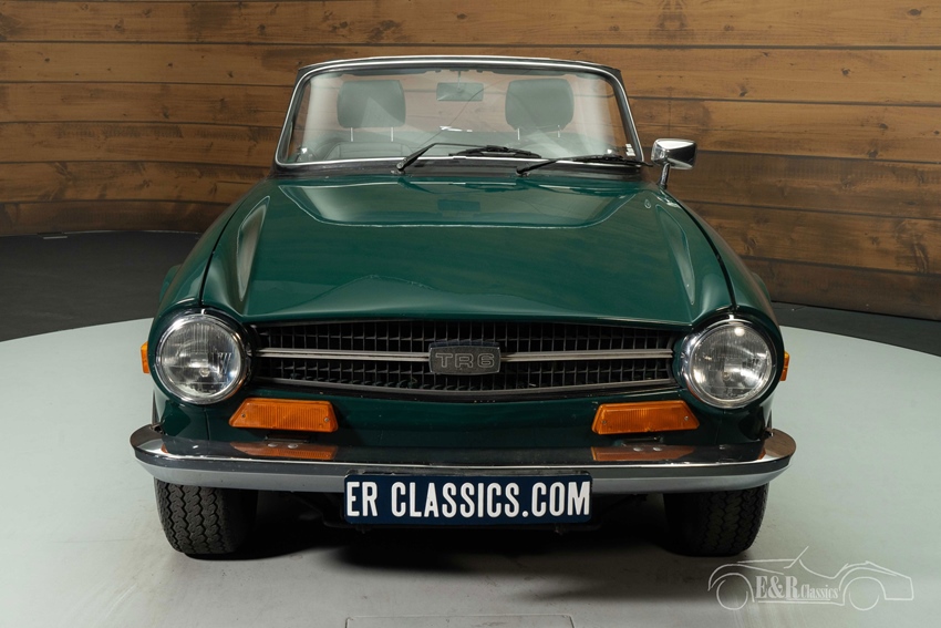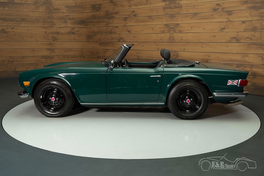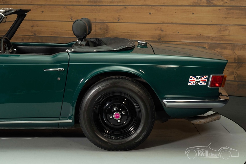 Triumph TR6 te koop in Mallard Green De carrosserie van de TR6 is uitgevoerd in de originele kleur Mallard Green, een diepe, klassieke tint die perfect aansluit op het sportieve karakter van de TR6. De auto wordt geleverd inclusief een zwarte soft top én een bijpassende hard top, waarmee hij geschikt is voor elk seizoen. De zwarte stalen velgen zorgen voor een stoere uitstraling die mooi contrasteert met het lakwerk. Binnenin vindt u luxe zwarte stoelen die perfect harmoniëren met het houten dashboard en de chromen details. Het interieur ademt Britse klasse en vormt een stijlvol samenspel met het exterieur — een combinatie die deze TR6 tot een tijdloze verschijning maakt.