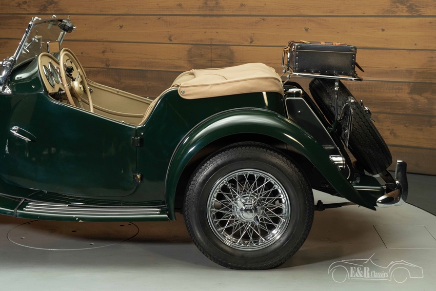 MG TD MK2 in British Racing Green te koop Het lakwerk in klassiek British Racing Green combineert prachtig met de chromen spaakwielen, die de vintage uitstraling compleet maken. De beigekleurige soft top met bijpassende zijraampjes en kofferrek met koffer geven de auto een charmante tour-look, perfect voor zomerse ritten of klassiekerevenementen. Het beigekleurige interieur is stijlvol bekleed en harmonieert prachtig met de buitenzijde, terwijl het minimalistische dashboard met klassieke klokken de nostalgie compleet maakt.