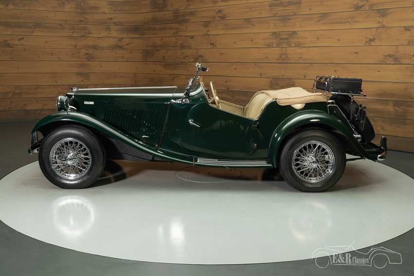 MG TD MK2 in British Racing Green te koop Het lakwerk in klassiek British Racing Green combineert prachtig met de chromen spaakwielen, die de vintage uitstraling compleet maken. De beigekleurige soft top met bijpassende zijraampjes en kofferrek met koffer geven de auto een charmante tour-look, perfect voor zomerse ritten of klassiekerevenementen. Het beigekleurige interieur is stijlvol bekleed en harmonieert prachtig met de buitenzijde, terwijl het minimalistische dashboard met klassieke klokken de nostalgie compleet maakt.