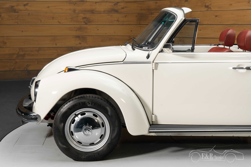 Witte Volkswagen Kever Cabriolet te koop Het stijlvolle wit van het lakwerk contrasteert schitterend met de bordeauxrode soft top en het bijpassende bordeauxrode interieur. De cabrioletkap laat zich gemakkelijk openen, waardoor je in een oogwenk van gesloten klassieker naar open zomerauto schakelt. Het interieur is met veel zorg bekleed en straalt luxe en nostalgie uit. De originele stalen velgen met verchroomde wieldoppen maken het klassieke plaatje compleet. Alles aan deze Volkswagen Kever Cabriolet ademt liefde voor detail – van de glanzende lak tot het stijlvolle samenspel tussen exterieur en interieur.