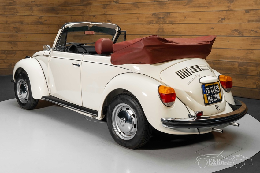 Witte Volkswagen Kever Cabriolet te koop Het stijlvolle wit van het lakwerk contrasteert schitterend met de bordeauxrode soft top en het bijpassende bordeauxrode interieur. De cabrioletkap laat zich gemakkelijk openen, waardoor je in een oogwenk van gesloten klassieker naar open zomerauto schakelt. Het interieur is met veel zorg bekleed en straalt luxe en nostalgie uit. De originele stalen velgen met verchroomde wieldoppen maken het klassieke plaatje compleet. Alles aan deze Volkswagen Kever Cabriolet ademt liefde voor detail – van de glanzende lak tot het stijlvolle samenspel tussen exterieur en interieur.