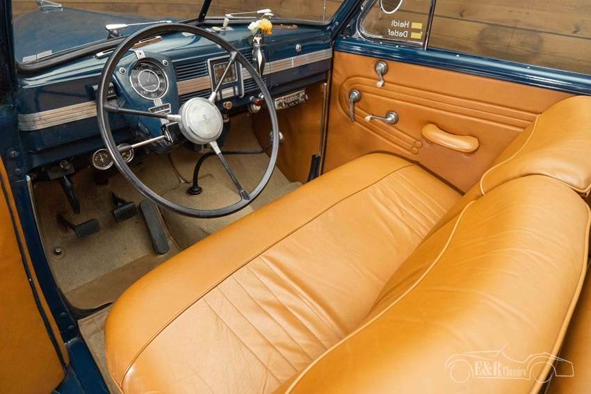 Donkerblauwe Opel Kapitän Cabriolet Het stijlvolle koetswerk van de Opel Kapitän Cabriolet is afgewerkt in een diepblauwe lak die prachtig contrasteert met de elegante zwarte Sonnenland soft top. De combinatie met de whitewall banden en originele wieldoppen zorgt voor een authentieke uitstraling die direct terugvoert naar de jaren ’30. Het interieur is bekleed met hoogwaardig bruin leder en verkeert in een nette staat. Het samenspel tussen het warme leer en de donkerblauwe lak, geeft deze Opel een tijdloze en charmante uitstraling. De verfijnde details in het dashboard, het grote stuur en de klassieke bedieningselementen maken het plaatje compleet.