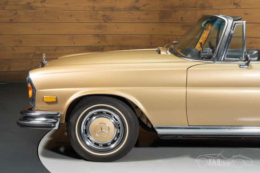 Mercedes-Benz 280 SE 3.5 Cabriolet Flachkühler met airconditioning te koop De uitstraling van deze 280 SE 3.5 Cabriolet is ronduit betoverend. Het goudkleurig metallic lakwerk vormt een prachtige combinatie met de donkerbruine soft top, waardoor de auto zowel met open als gesloten kap een stijlvolle indruk maakt. Het chroomwerk en de klassieke wieldoppen complementeren het klassieke design en onderstrepen zijn luxe uitstraling. Binnenin wacht een donkerbruin lederen interieur dat, hoewel voorzien van enkele gebruikssporen, nog steeds een warme en authentieke sfeer ademt. Het samenspel tussen de goudkleurige carrosserie en het donkere interieur creëert een tijdloze elegantie die zeldzaam is. Deze auto biedt niet alleen een uitzonderlijke rijervaring, maar ook een visueel feest voor de liefhebber.